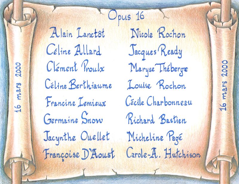 Le 16 mars 2000 quinze choristes se réunissaient autour du chef de choeur Alain Lanctôt et fondaient l’Ensemble vocal Opus 16. Nous étions 16 et c’était le 16 mars mais un autre élément s’ajoutait à la naissance du groupe. Norbert Ott, un chef de choeur de Lorraine et ami d’Alain, dirigeait à ce moment un groupe appelé Opus 57 (du numéro du département français). Le groupe québécois avait déjà envie de voyager et on se disait que ce serait une bonne idée de rassembler les deux Opus un de ces jours. Voilà c’était parti!